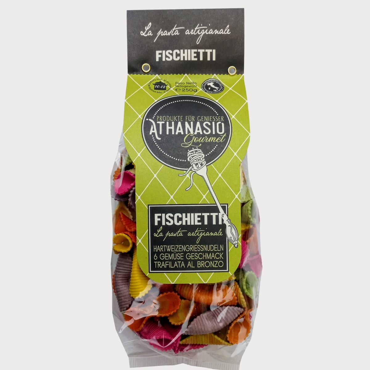 Ein farbenfrohes Fest für die Sinne: Unsere Fischietti mit 6 Gemüse bringen pure Lebensfreude auf den Teller. Aus bestem Hartweizengrieß aus Apulia in Süditalien und traditionell durch Bronzeformen gezogen, besitzen sie eine herrlich raue Oberfläche, die Saucen perfekt aufnimmt. Spinat, rote Bete, Kurkuma, Paprika und schwarze Möhre schenken dieser Pasta ihre natürlich fröhliche Farbpalette und einen zart-gemüsigen Duft nach mediterraner Natur. Langsam getrocknet für ein perfektes, bissfestes Mundgefühl – wie hausgemacht aus der Küche einer italienischen Nonna.