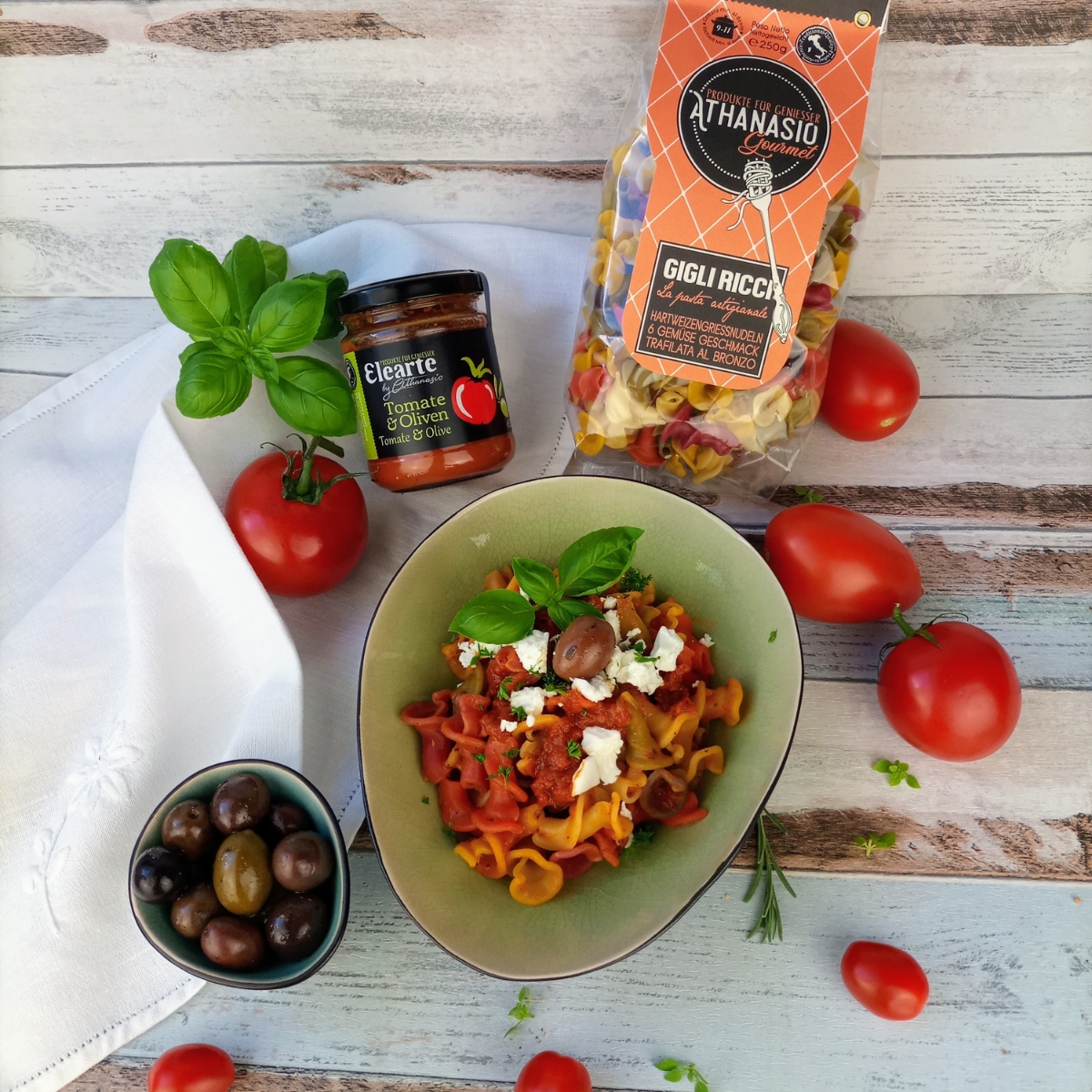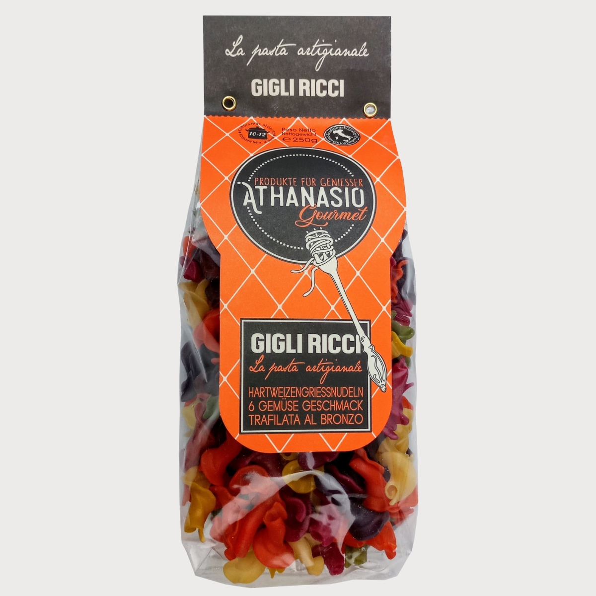 Unsere Gigli Ricci mit 6 Gemüse von ATHANASIO Gourmet bringen pure italienische Lebensfreude auf den Teller. Aus bestem Hartweizengrieß aus Apulia in Süditalien und natürlichem Gemüse wie Spinat, Rote Bete, Kurkuma, Paprika und schwarzer Möhre gefertigt, entstehen farbenfrohe Nudeln, die duftend und lebendig wirken – wie ein Spaziergang durch die mediterrane Natur.