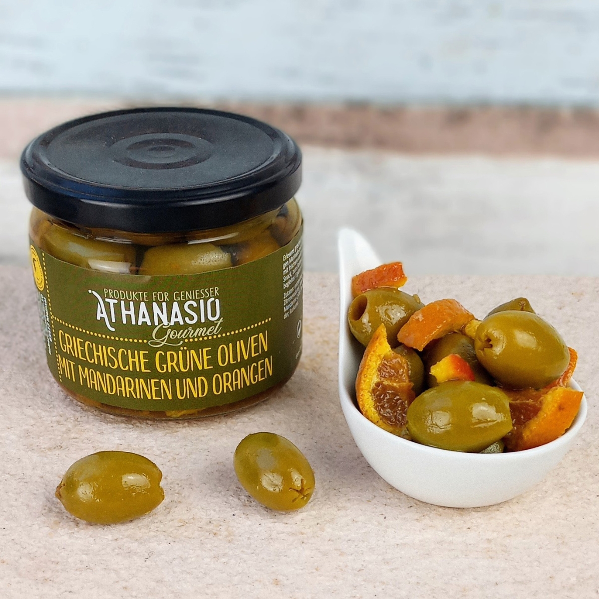 Die Griechischen grünen Oliven mit Mandarinen & Orangen von Athanasio Gourmet verbinden mediterrane Tradition mit einer modernen, fruchtigen Note. Handverlesene Chalkidiki-Oliven treffen auf die spritzige Frische sonnengereifter Zitrusfrüchte – Mandarinen und Orangen. Ihre ätherischen Öle verleihen den Oliven ein unvergleichliches Aroma, das an Mittelmeer erinnert.