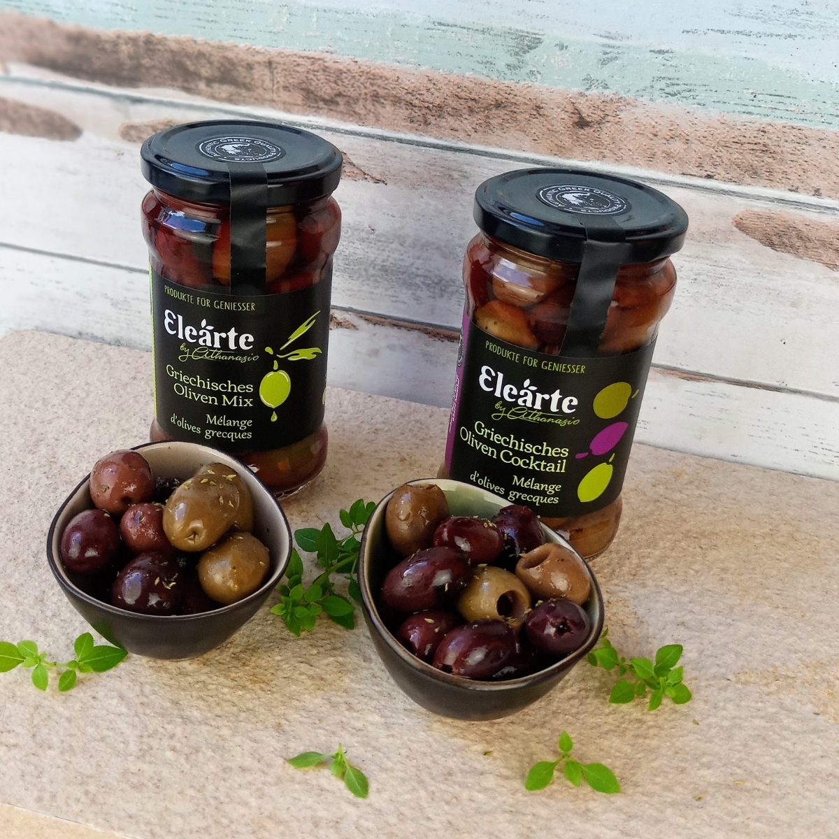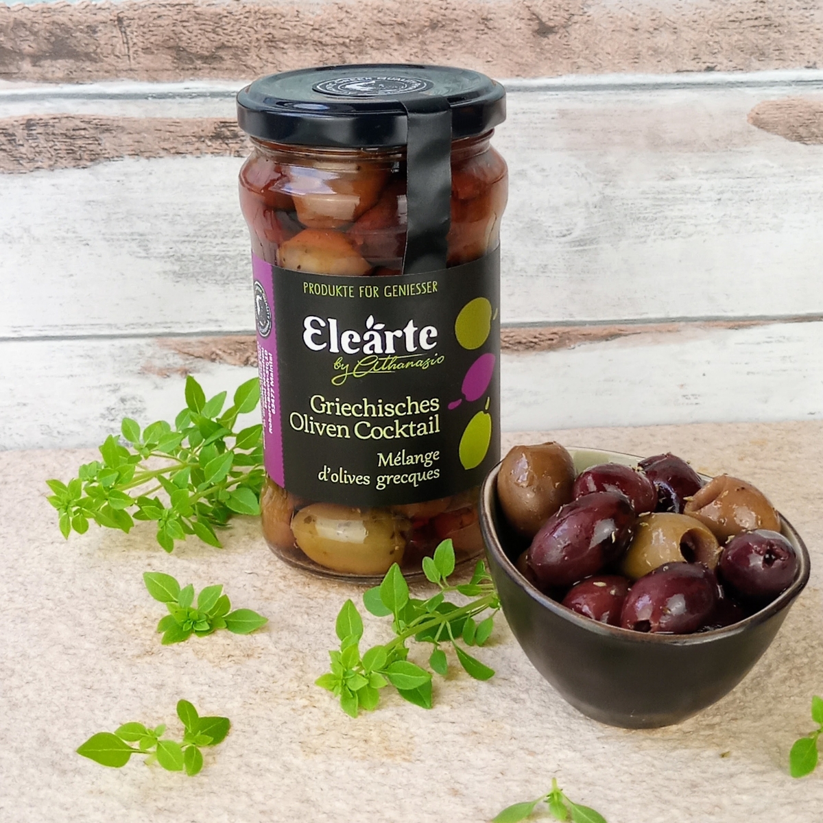 Der Griechische Oliven Cocktail ohne Stein von Elearte by Athanasio bringt die ganze Vielfalt Griechenlands direkt auf den Tisch. In ihm vereinen sich sonnenverwöhnte Kalamata-Oliven mit ihrem fruchtig-intensiven Aroma, milde Amfissa-Oliven und knackige grüne Chalkidiki-Oliven. Von kleinen Bauern liebevoll gepflegt und von Hand geerntet, reifen sie natürlich heran – ohne künstliche Farbstoffe oder Zusätze. In milder Meersalzlake mit Weinessig und Oregano eingelegt, entfalten sie ihr authentisches, mediterranes Aroma.