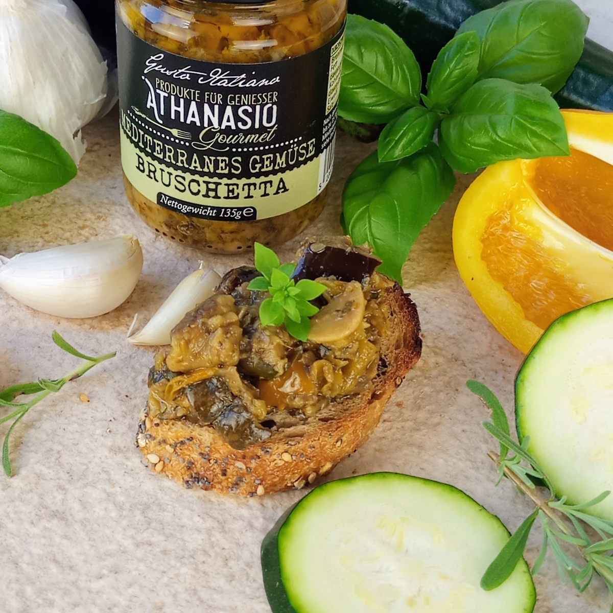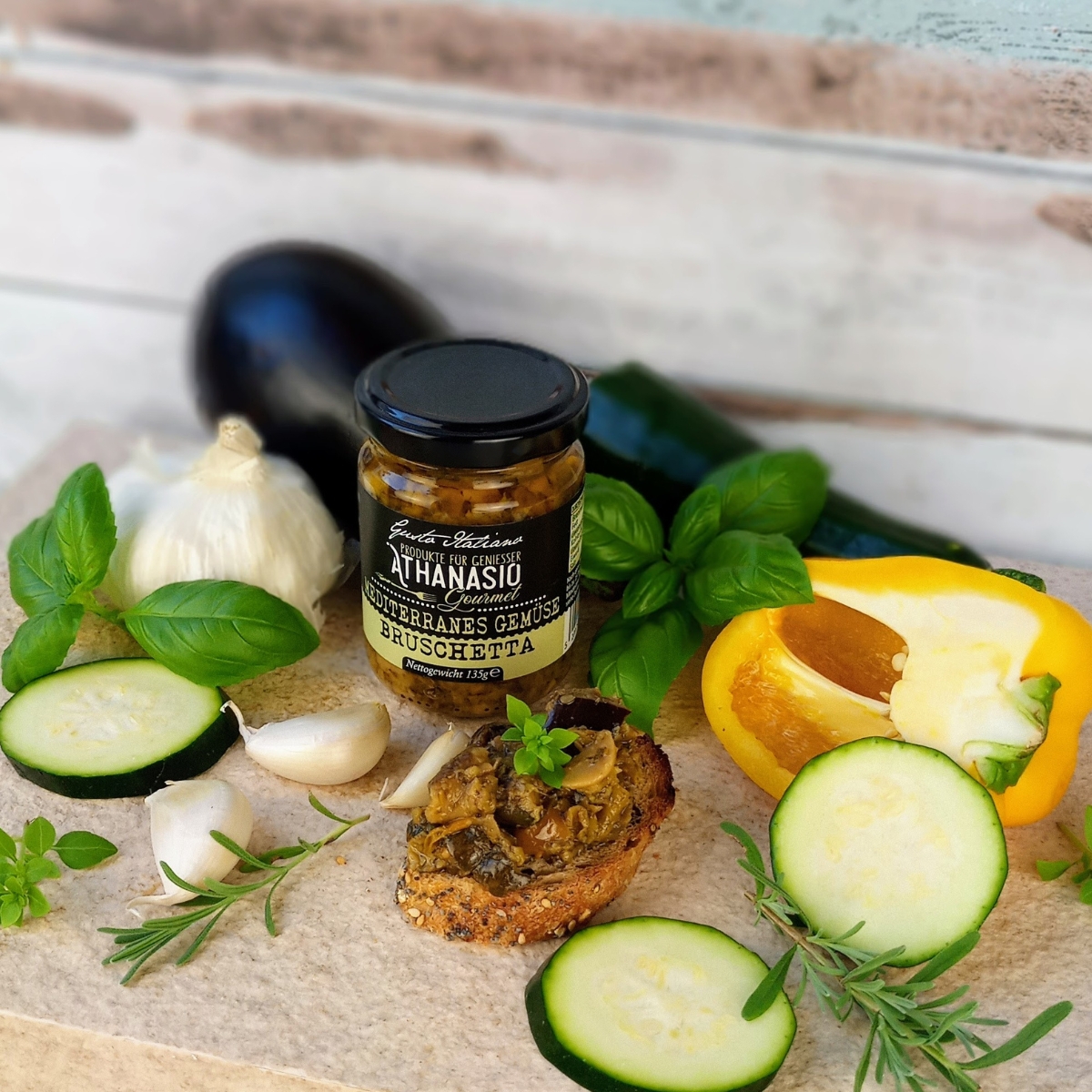Die MEDITERRANES GEMÜSE BRUSCHETTA von ATHANASIO Gourmet ist eine Hommage an die sonnige Küche Italiens.
