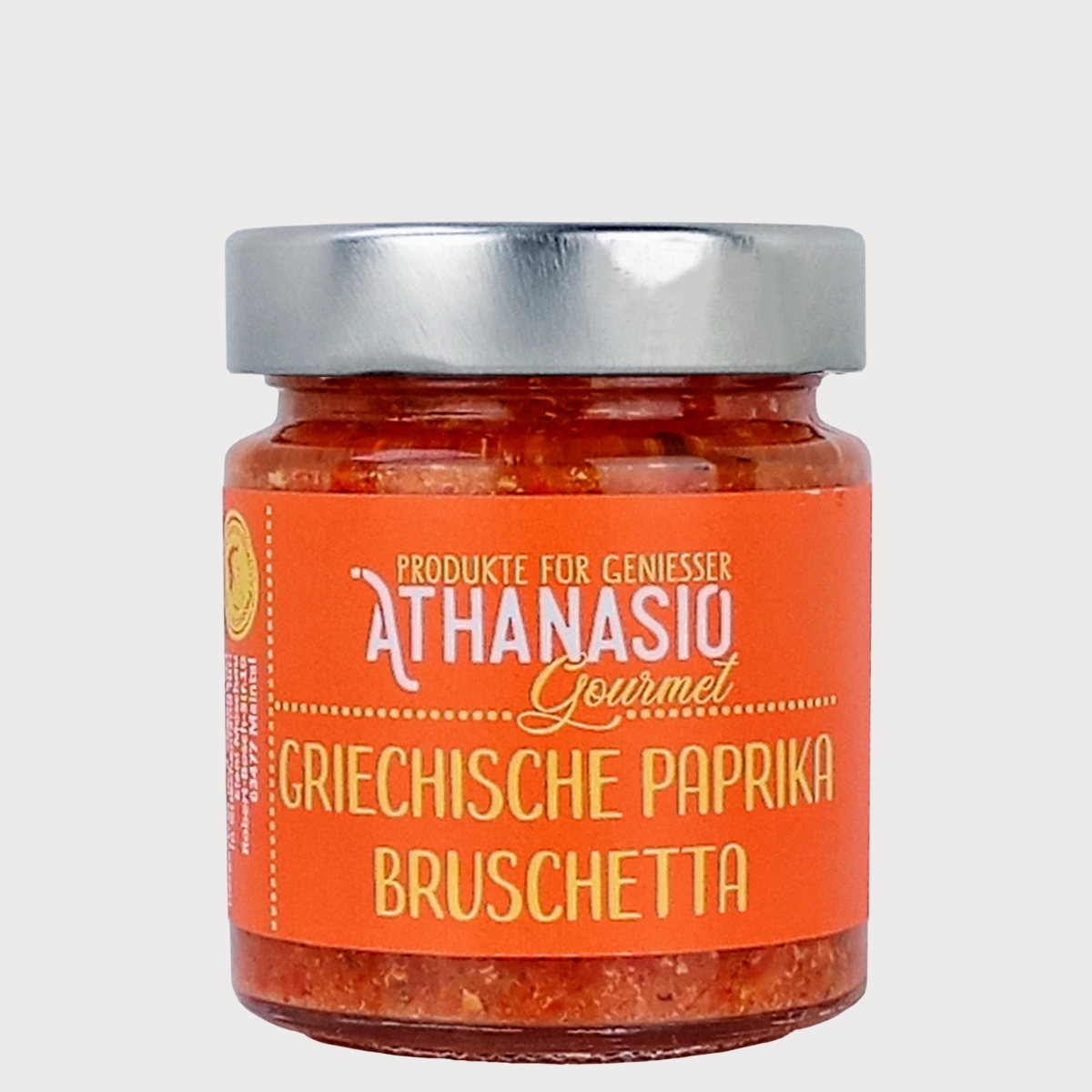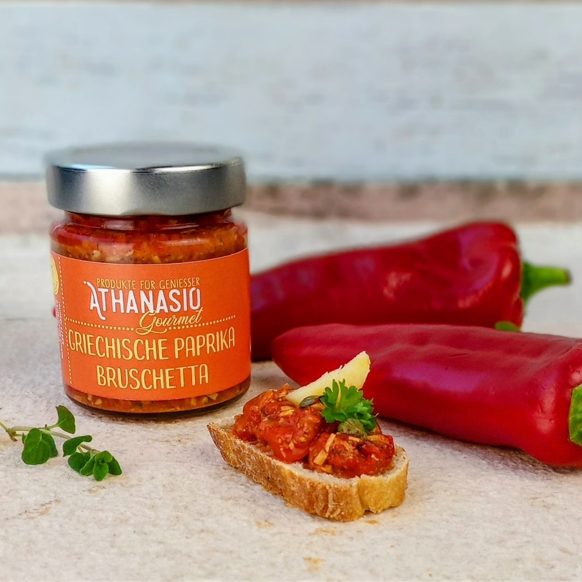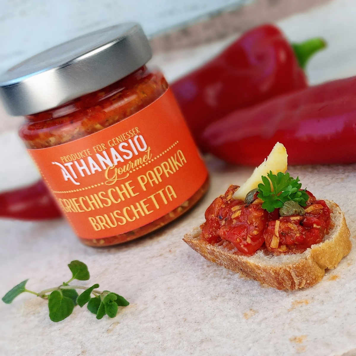 Sonnenverwöhnte rote Spitz-Paprika, über offenem Feuer geröstet, treffen auf aromatischen griechischen Hartkäse, natives Olivenöl extra und duftende Kräuter – das ist die Griechische Paprika Bruschetta von ATHANASIO Gourmet.