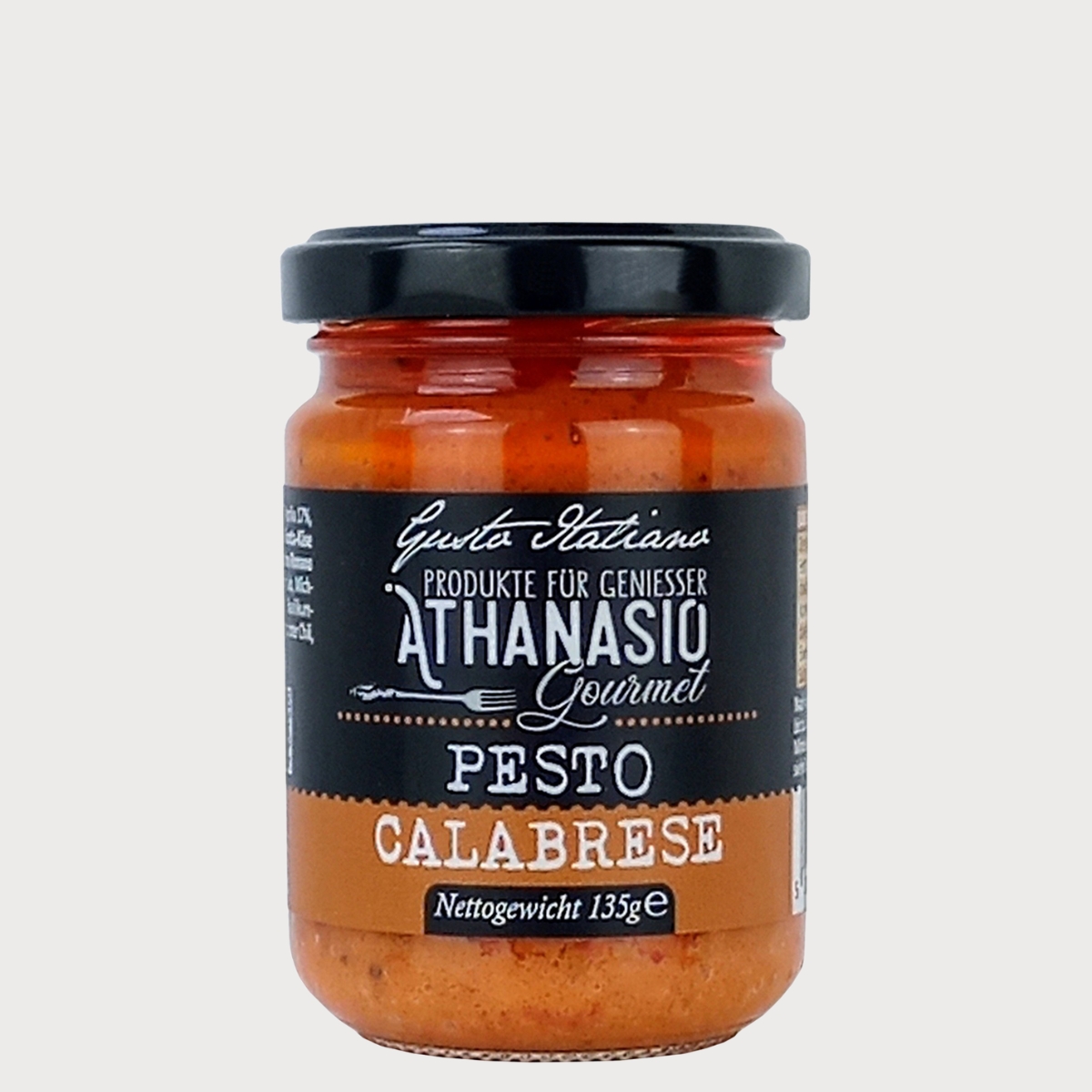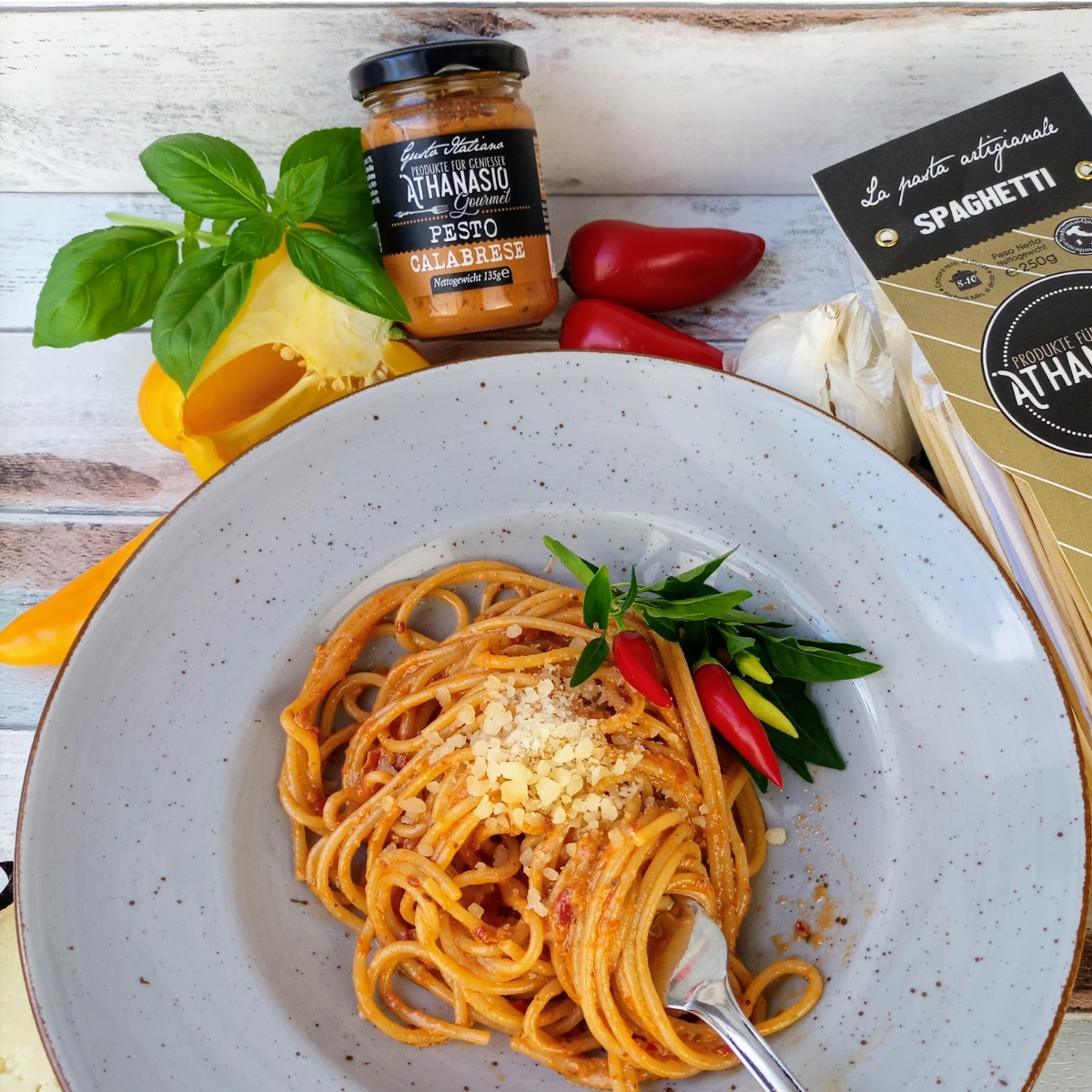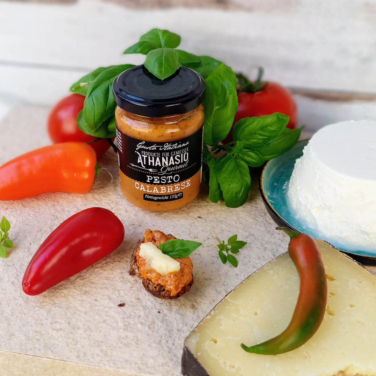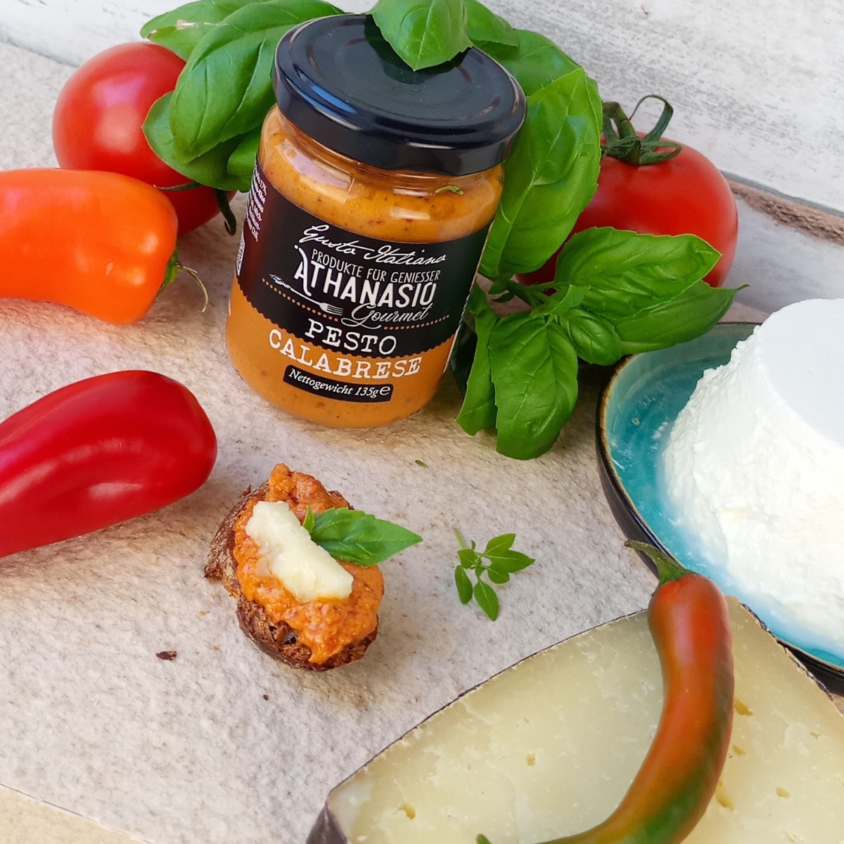 Das PESTO CALABRESE von ATHANASIO Gourmet vereint die ganze Leidenschaft Süditaliens in einem Glas. Inspiriert von den Aromen Calabrias wird es aus Paprika, getrockneten Tomaten, cremigem Ricotta und würzigem Pecorino Käse frisch zubereitet. Diese harmonische Kombination verleiht dem Pesto seine aromatisch-pikante Note, die sowohl cremig als auch kraftvoll würzig ist. Ideal zu Spaghetti, auf frisch geröstetem Brot oder als Basis für herzhafte, mediterrane Gerichte bringt es den unverfälschten Geschmack Italiens in die Küche. Authentisch, original und voller Genuss – wie ein Stück Calabria auf dem Teller.