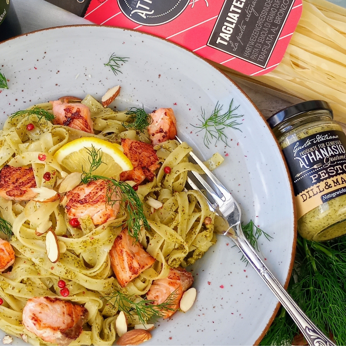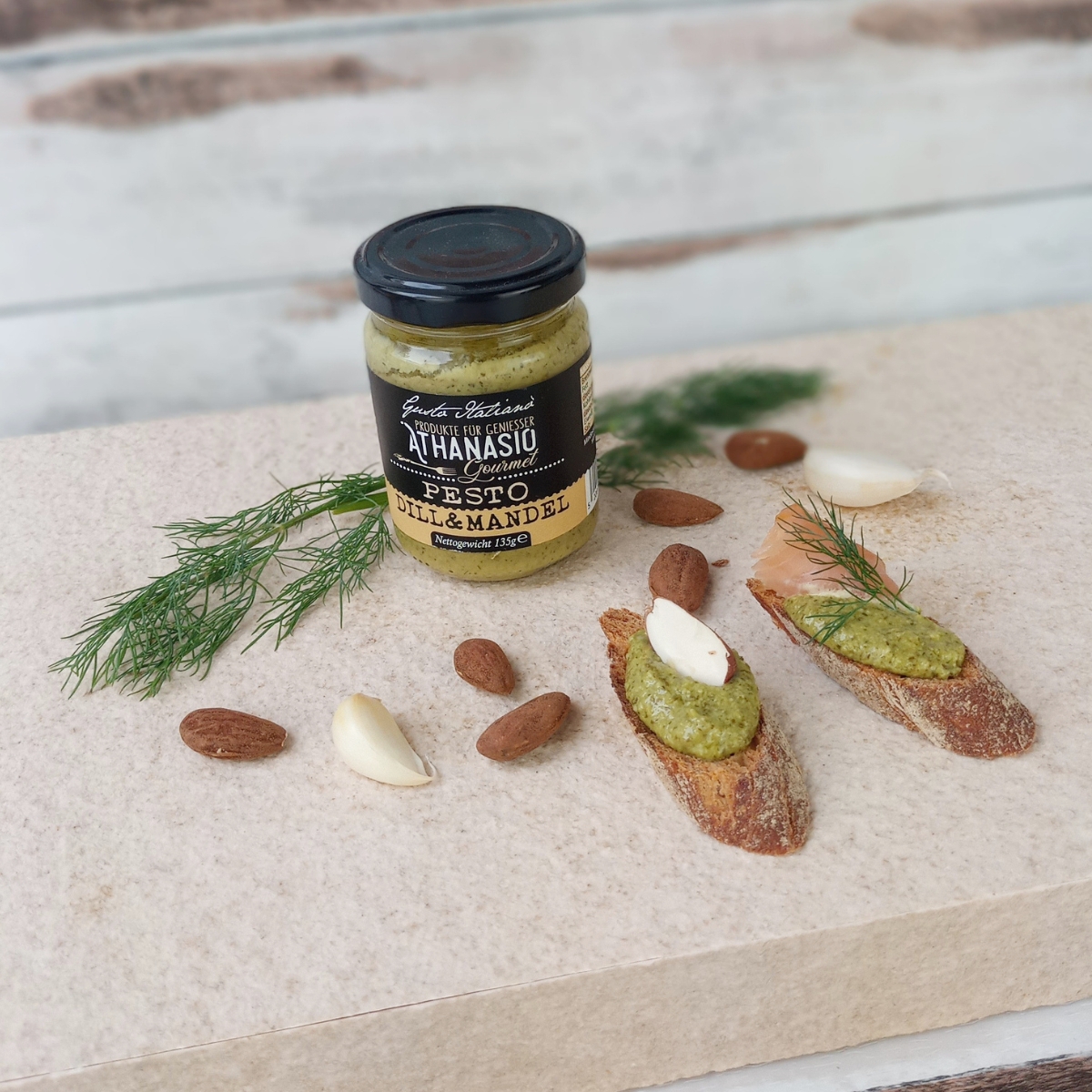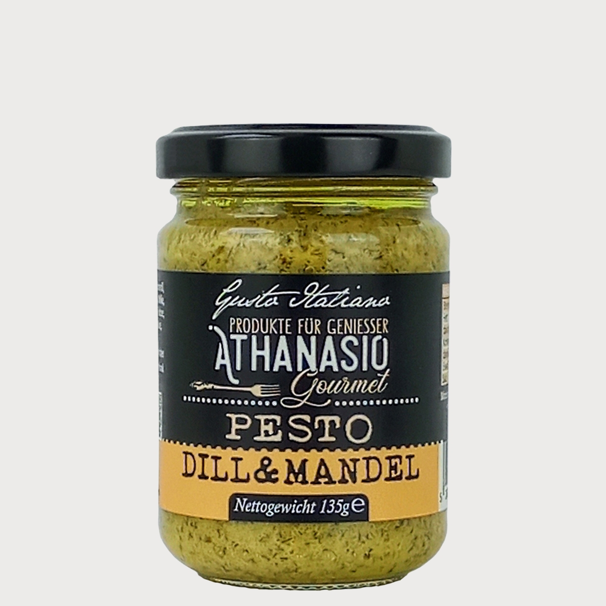 Das PESTO DILL & MANDEL von ATHANASIO Gourmet vereint italienische Esskultur mit feinster Raffinesse. Inspiriert von Liguriens Küsten und dem Piemont entfaltet es ein harmonisches Zusammenspiel aus frischem Dill und knuspriger Mandelnote. Zart und cremig, zugleich aromatisch und leicht knusprig – dieses Pesto überrascht mit eleganter Balance und einzigartigem Charakter. Ideal zu Pasta, Fisch, Kartoffeln, Eiern, Champignons oder Gemüse. Auch als Basis für Dressings und Dips sorgt es für eine besondere Note. Ein original italienisches Gaumenerlebnis, das zum Verlieben einlädt.