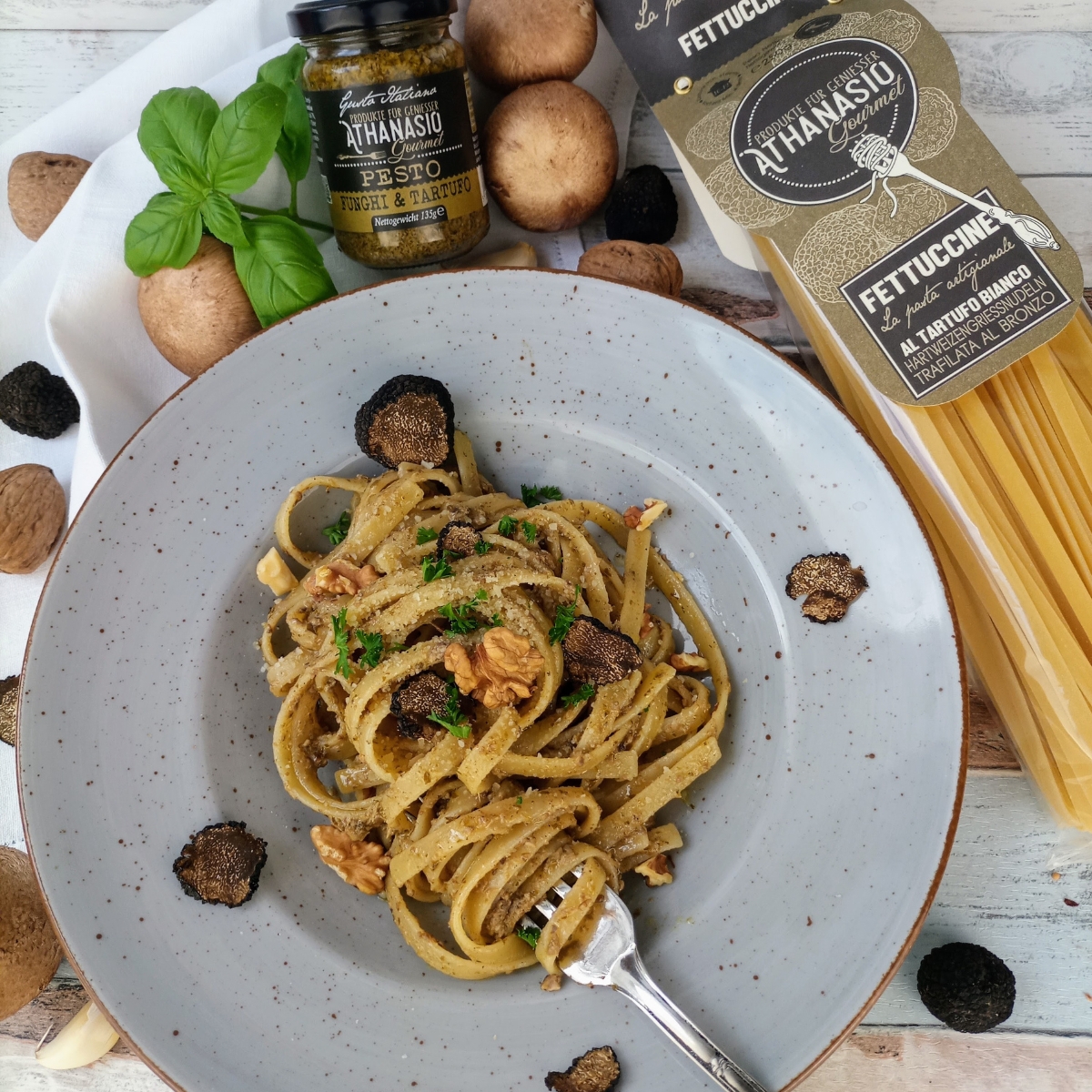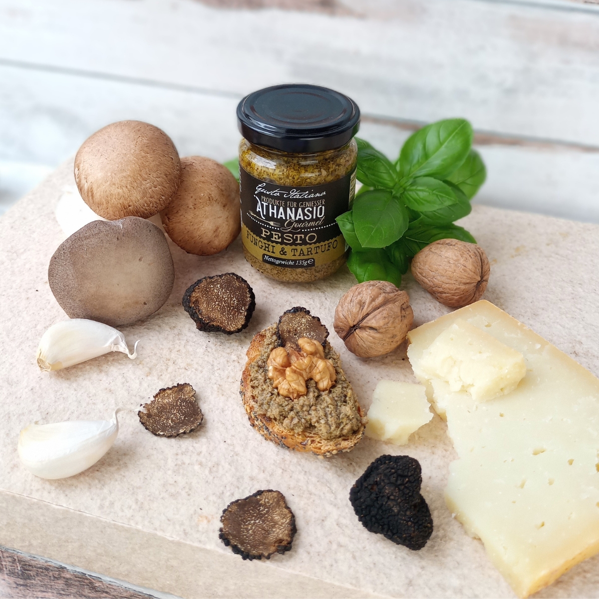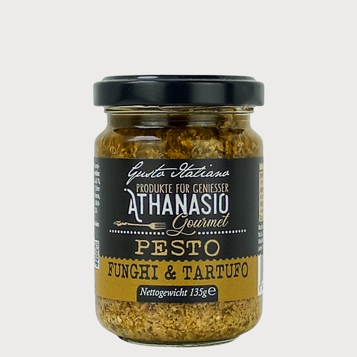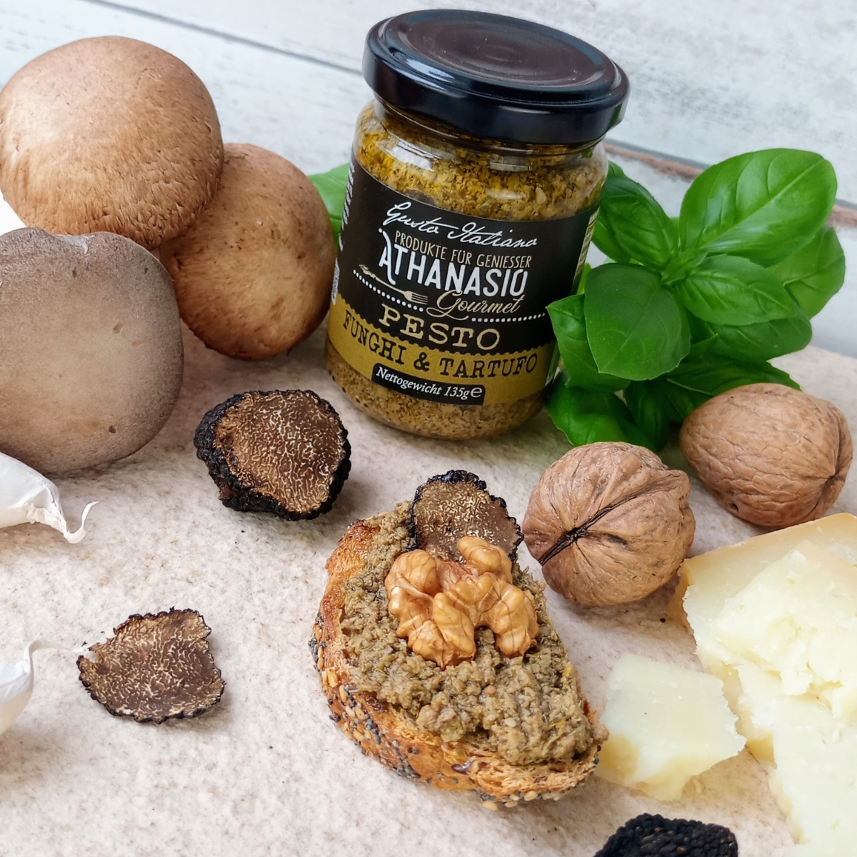 Das PESTO FUNGHI & TARTUFO von ATHANASIO vereint die Erdigkeit feiner Champignons mit der luxuriösen Eleganz von edlem Trüffel. Verfeinert mit knackigen Walnüssen, bestem Parmesan und ausgewogenen Gewürzen entsteht eine aromatische Komposition, die den Gaumen mit Tiefe und Raffinesse begeistert. Perfekt zu Pasta, Risotto, auf frisch geröstetem Brot oder als feine Zutat für Fleisch- und Gemüsegerichte – dieses Pesto bringt italienische Feinkostkultur auf den Punkt. Ein echtes Gaumenerlebnis, das Genussmenschen verführt.