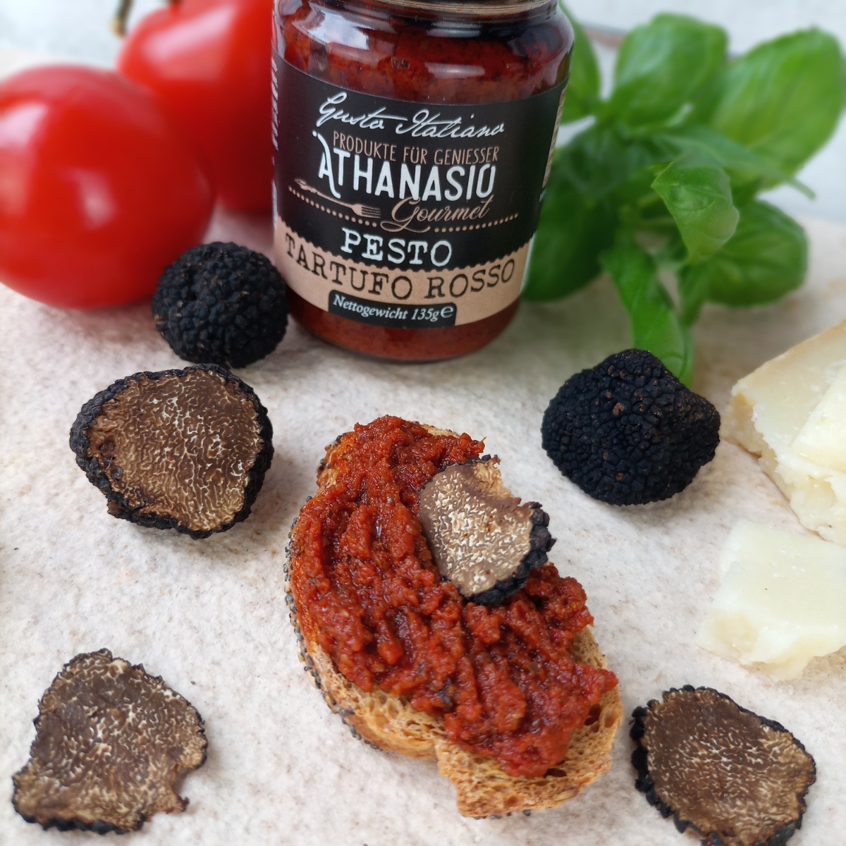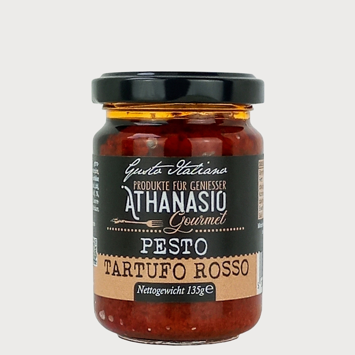 Das PESTO TARTUFFO ROSSO von ATHANASIO Gourmet verbindet die fruchtige Intensität sonnengereifter Tomaten mit der edlen Note von Sommertrüffeln. Sorgfältig zubereitet mit Parmesankäse und feinen Gewürzen entsteht eine saftige Komposition, die durch Eleganz und Tiefe besticht. Mit Sommer Trüffel erhält das Pesto seine unverkennbare Trüffel-Note, die jeden Bissen zu einem Gourmetmoment macht. Ob zu Pasta, als Bruschetta-Aufstrich, als Dip oder raffinierte Zutat in mediterranen Fleisch- und Gemüsegerichten – dieses Pesto bringt authentischen Luxus aus Italien direkt in die Küche.