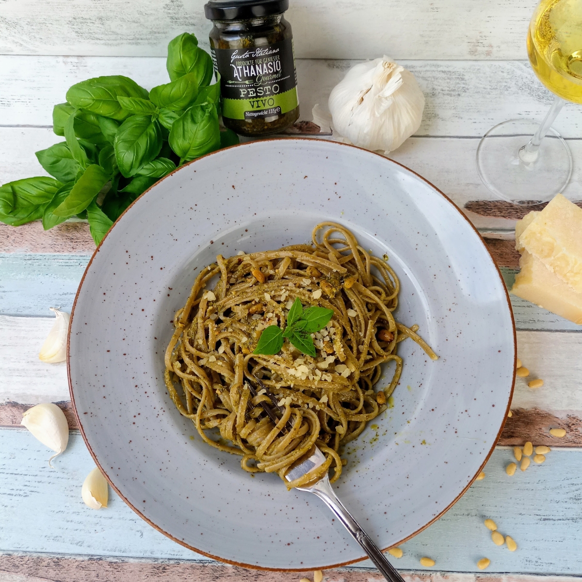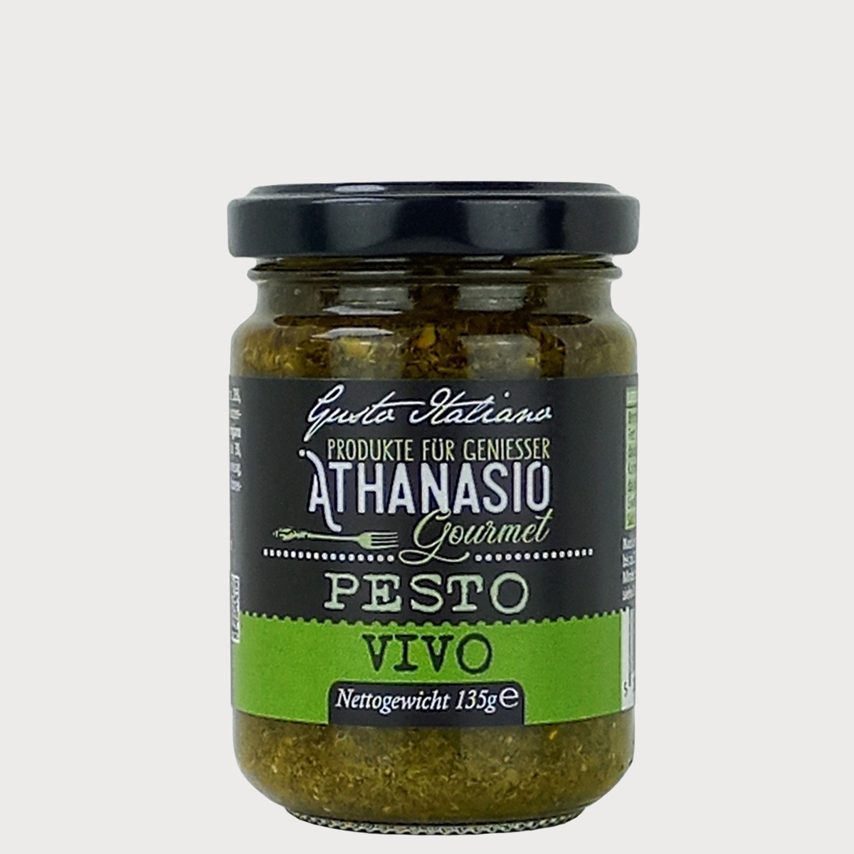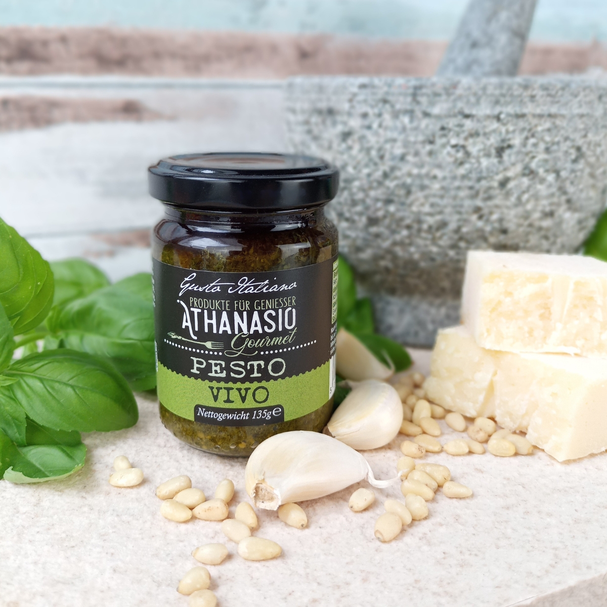 Das PESTO VIVO von ATHANASIO Gourmet ist Basilikum-Genuss in seiner reinsten Form. Für 100g Pesto werden ganze 60g frisches Basilikum verarbeitet – ein Versprechen für Intensität und Frische. Verfeinert mit nativem Olivenöl extra, aromatischen Pinienkernen und original Parmigiano Reggiano DOP entsteht eine authentische Spezialität, die durch ihre ausgewogene Balance begeistert. Knoblauch und ein Hauch von Weißweinessig runden das Geschmackserlebnis harmonisch ab. Perfekt zu Pasta, als Dip zu Gemüse, als Dressing zu Salaten, verfeinert Fleisch oder Fisch Gerichte. Dieses Pesto bringt die Leichtigkeit Italiens in jede Küche. Original, authentisch, voller mediterraner Lebensfreude.