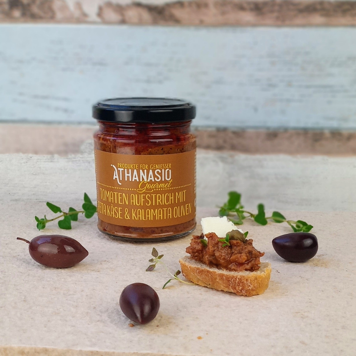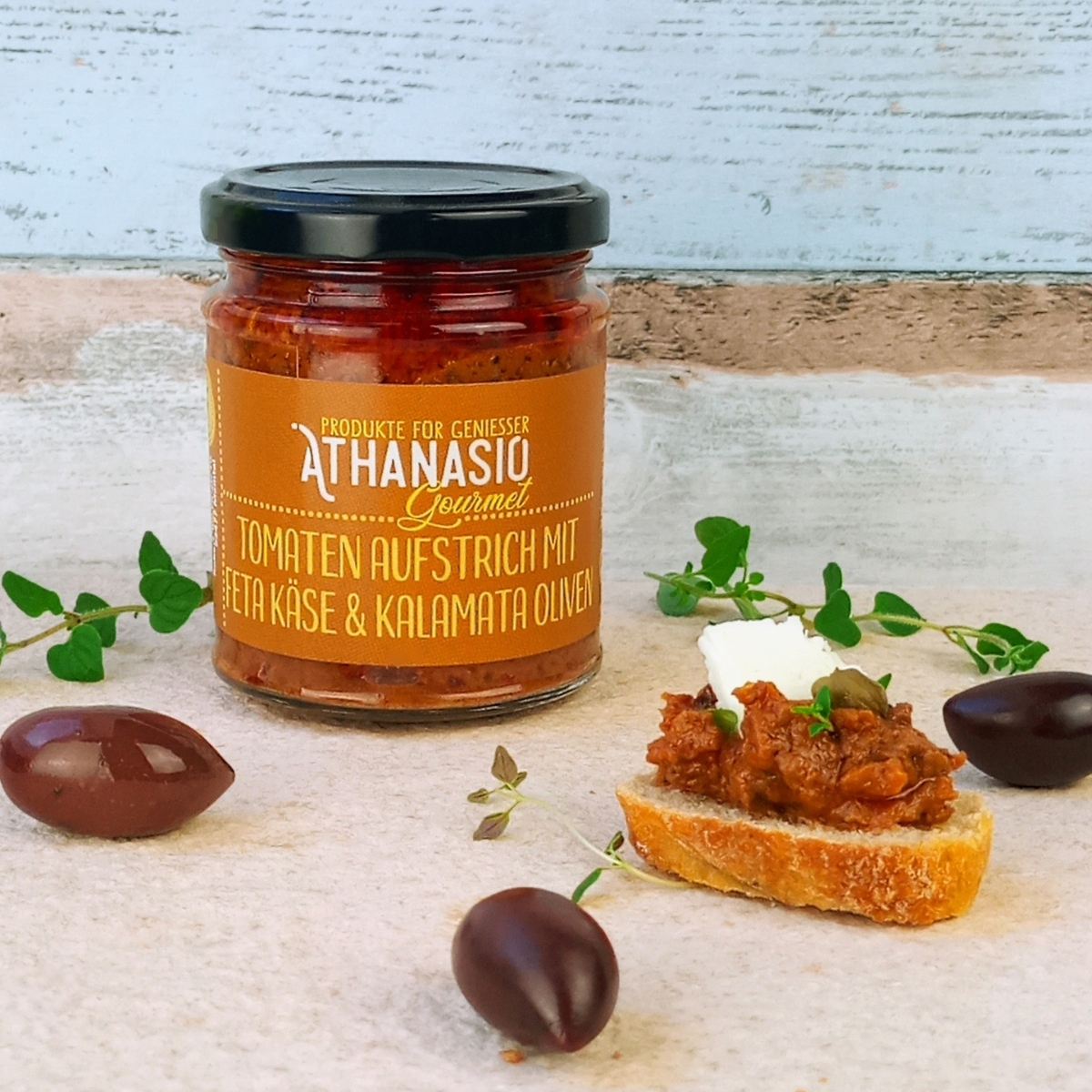 Der Tomaten Aufstrich mit Feta & Kalamata-Oliven von ATHANASIO Gourmet bringt das authentische Aroma Griechenlands direkt auf Ihren Tisch.